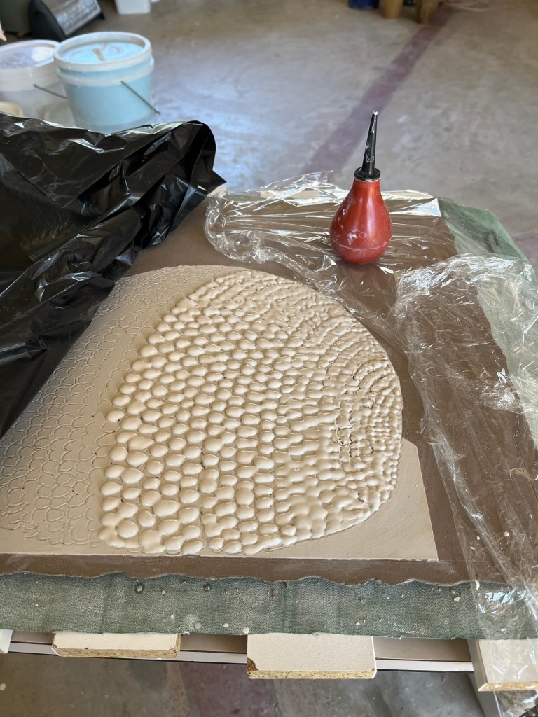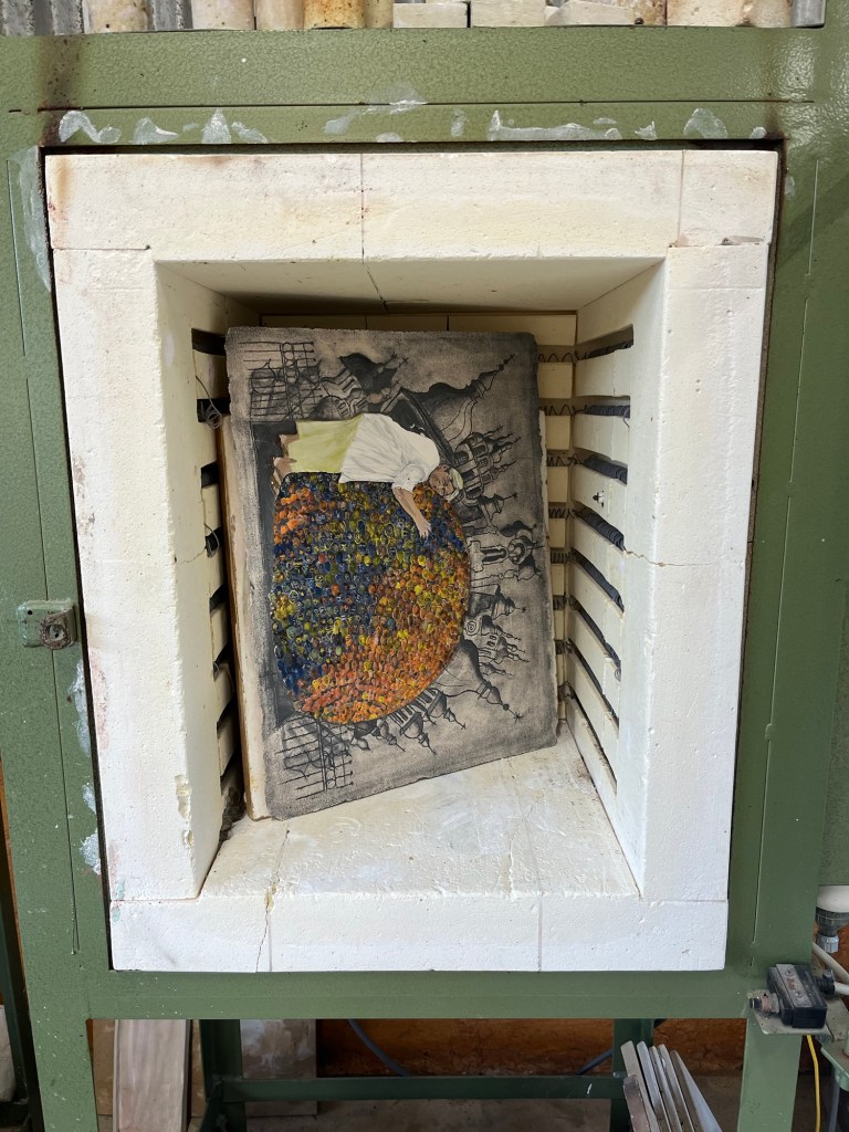 This is the finished artwork painted on a clay surface. The Giant ball of Pysanki- a public Art piece at the beautiful majestic enclosure of THE LAVRA in Kyiv. My friend took a video of the spectacle and thought I was crazy – as I embraced it. All the eggs were wooden and painted by children and attached with metal rods onto a metal sphere! My sphere of Eggs was the only part of the piece I glazed with ceramic glaze!! They sparkle for me.