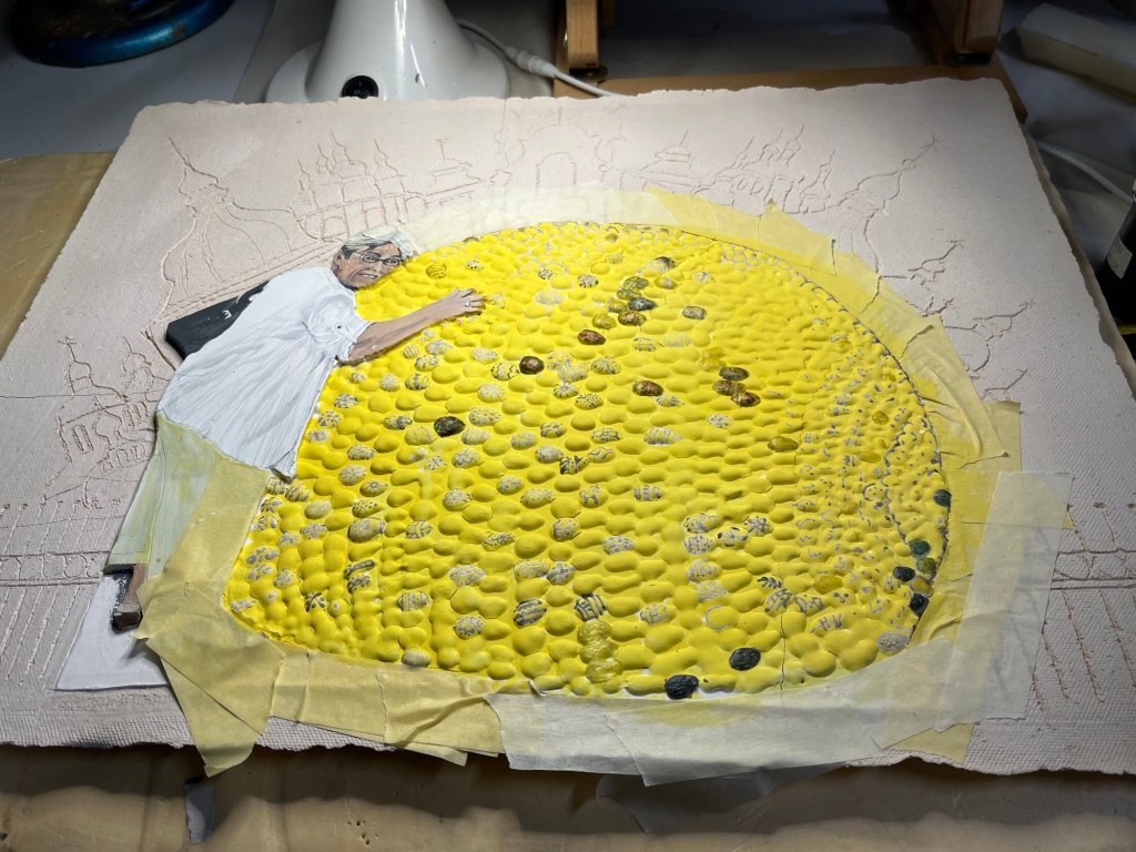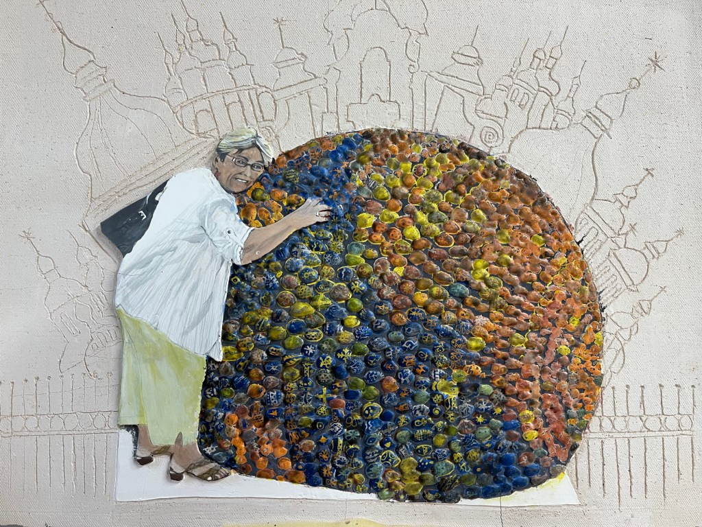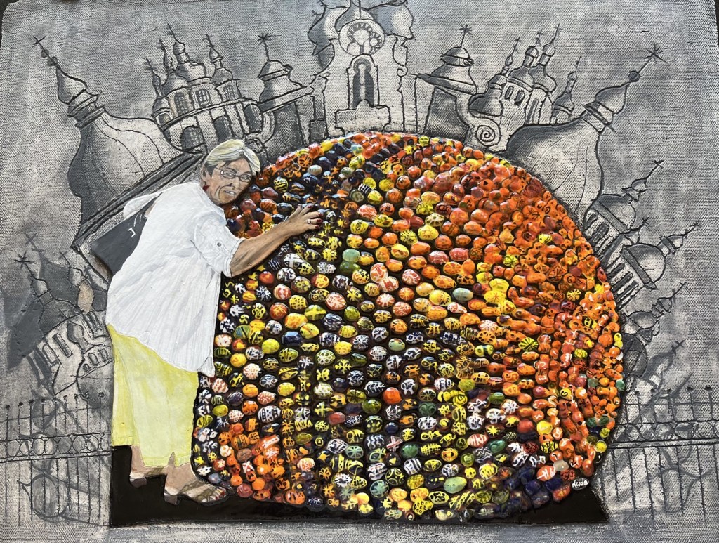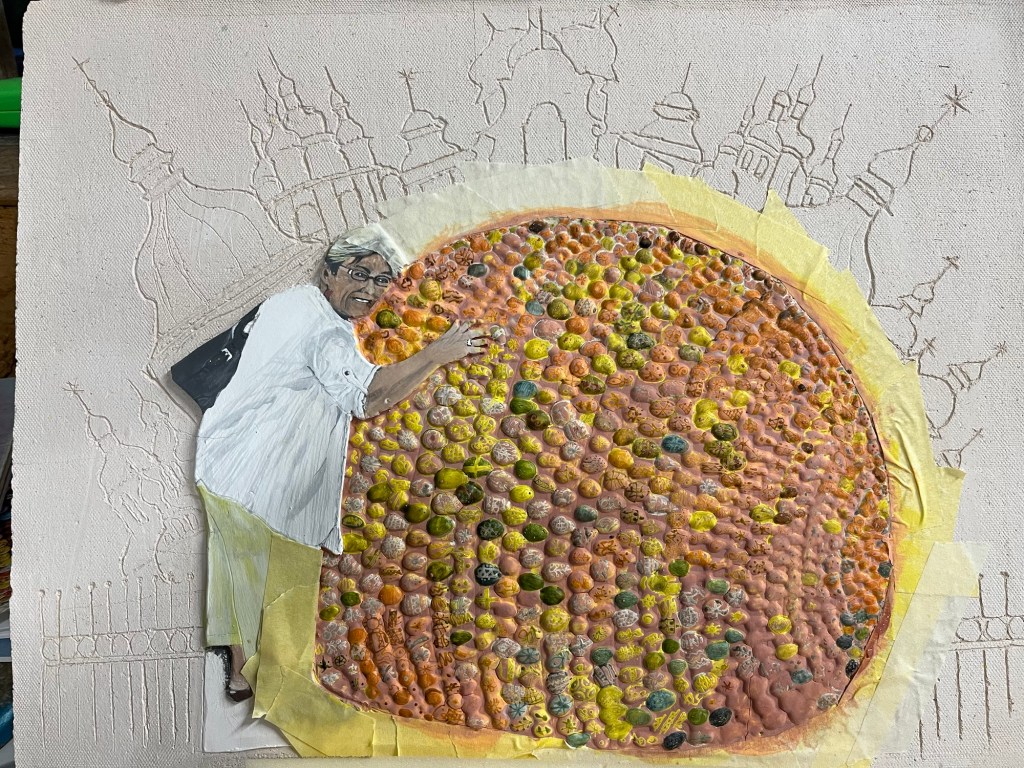 These images show the creation of a piece about Ukrainian culture. I worked on this piece inspired by a photograph I took in 2010 at the heritage place in Kyiv called the Lavra -a revered and historic place of worship!