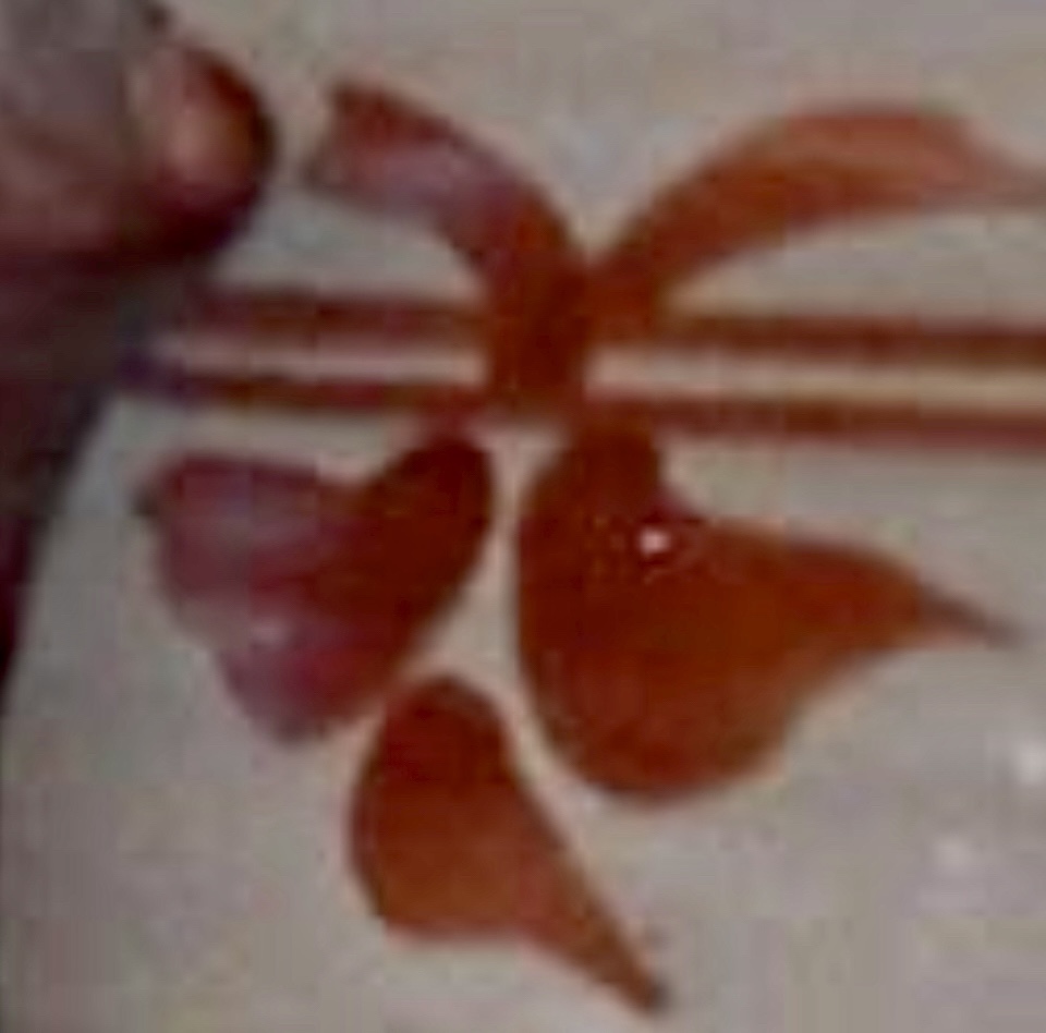 I chose wax resist because I had been a very experienced decorator of Ukrainian Pysanki. What began as a leaf motive eventually became a mother bird flying off followed by two- three baby birds. This was usually applied to bisque ware and then the pot would be immersed into liquid glaze. For production work it was quick and efficient. I loved working with hot wax.
